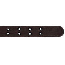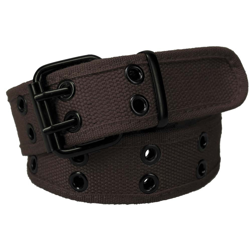 The belt features two rows of grommets, and both the grommets and roller buckle are shiny black hardware. The belt measures about 1.5-inches wide, which is a common belt width.