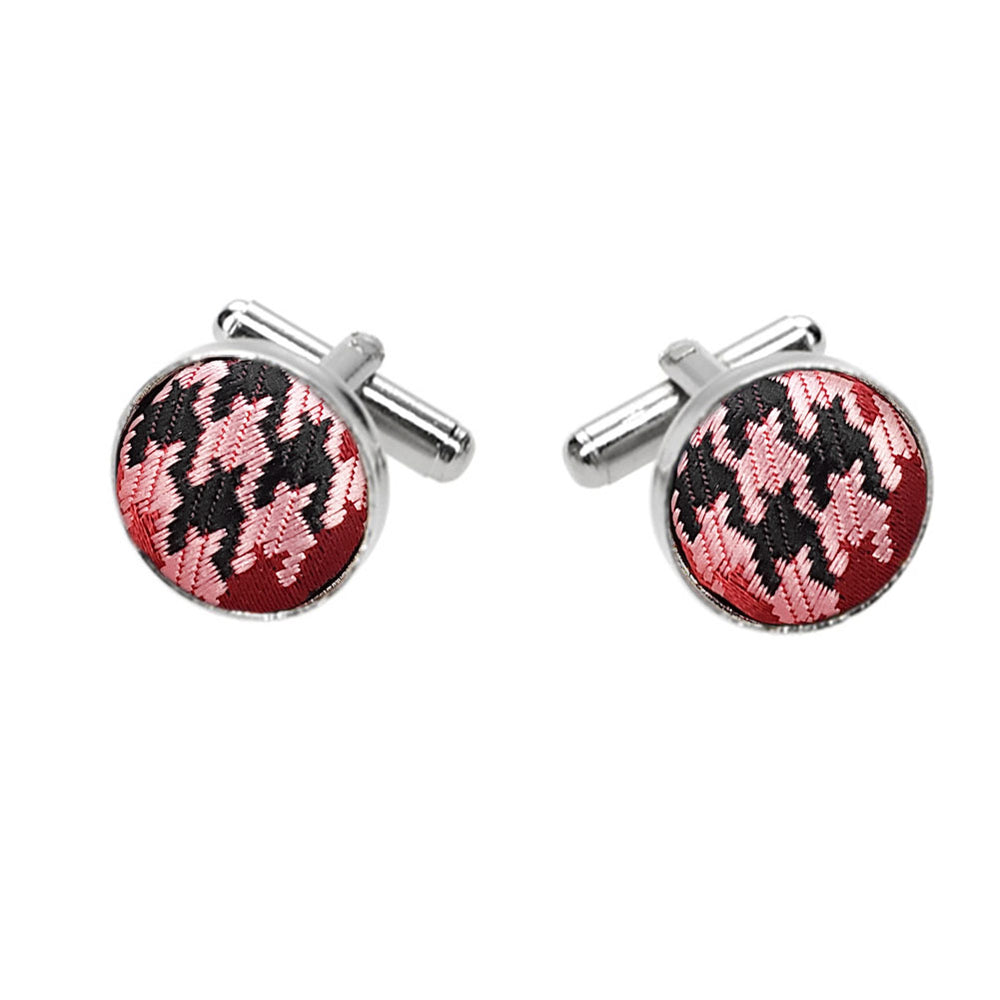 These burgundy and pink houndstooth cufflinks will make his outfit. What a great pattern for gifts, grooms or the office. The rim and backing of these cufflinks are silver-tone, and the classic pattern is made of fabric. Easy to match and wear.