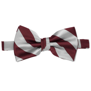 This burgundy and silver striped bow tie features a pre-tied, band collar style that expands to fit neck sizes up to 19-inches. Made from all polyester microfiber, it is designed to match our bestselling men's burgundy and silver striped tie. Matching pocket squares available, too.
