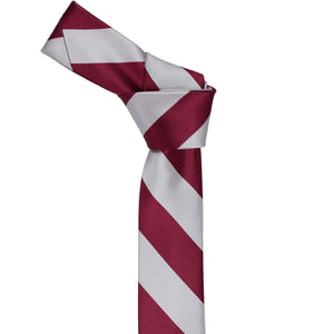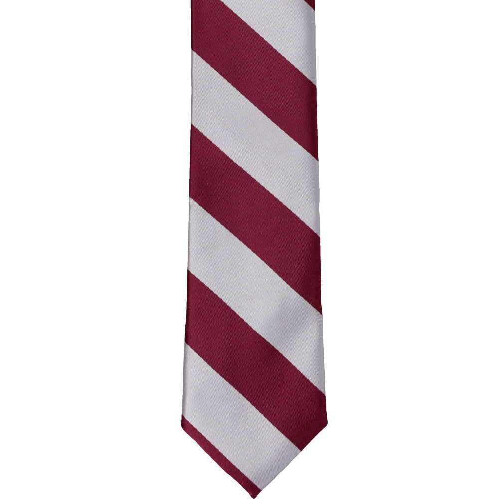 Our most popular striped ties are now available in a trendy, 2-inch width. This burgundy and silver skinny striped tie is made from heavyweight woven material with a smooth, satin finish. Look for this popular color combo in a men's traditional-width necktie, bow tie, pocket square and boys' tie.