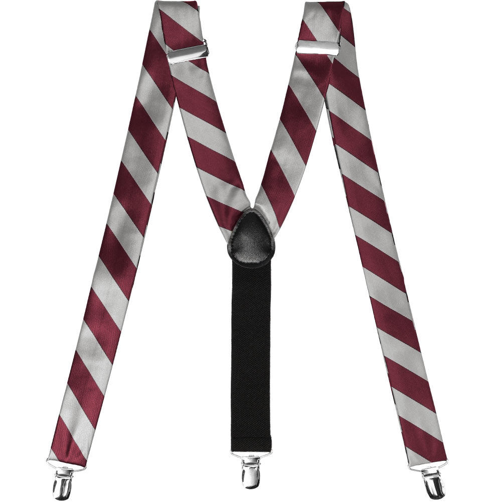 Whether you're showing your school spirit or rooting for your favorite team, these burgundy and silver striped suspenders are a must. Made from the same material as our ties, these suspenders feature 1.25-inch wide straps with 0.75-inch wide stripes. They adjust from approximately 30.5 to 49-inches to fit most men, women and teens and hold securely in place with three silver-tone clips. Y-back design with a black crosspatch. Looks great with the matching bow tie and socks!