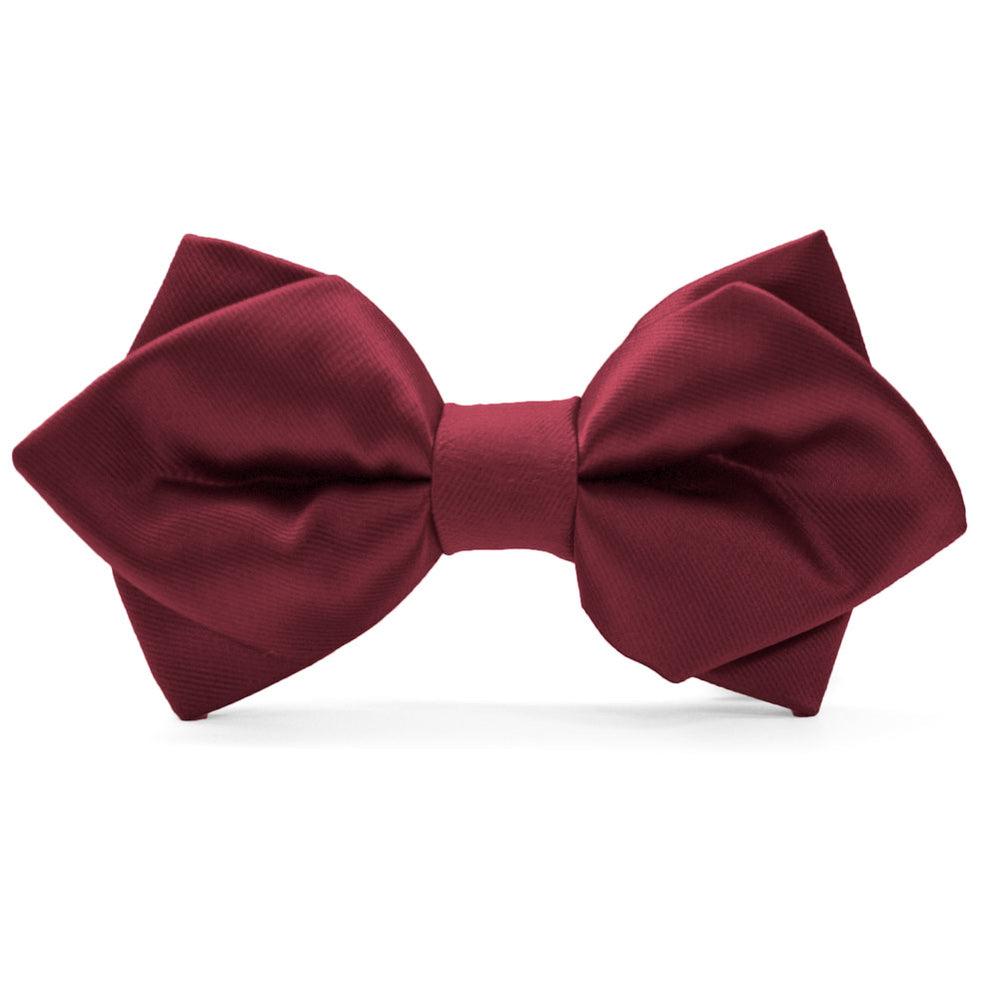 This burgundy diamond tip bow tie is richly colored and sophisticated. It features diamond tips in the front and traditional bow tips in the back. The bow tie attaches securely around the neck via an adjustable band that expands to fit neck sizes from 12 to 21-inches. It's made from heavyweight woven material with slight ribbing. See related products below for matching pocket squares and accessories.