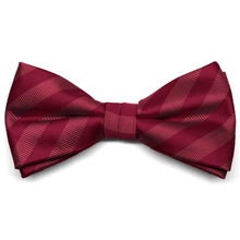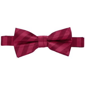 Charm them in this burgundy striped bow tie. It features alternating satin and ribbed stripes that create a tone-on-tone look. Because this bow tie is as easy to match as a solid color bow tie, we often see it worn for groomsmen attire. Give it a try for your next formal event or wear it to the office. You can't go wrong with a classic like burgundy. Don't forget to purchase the matching pocket square to complete your formal look.