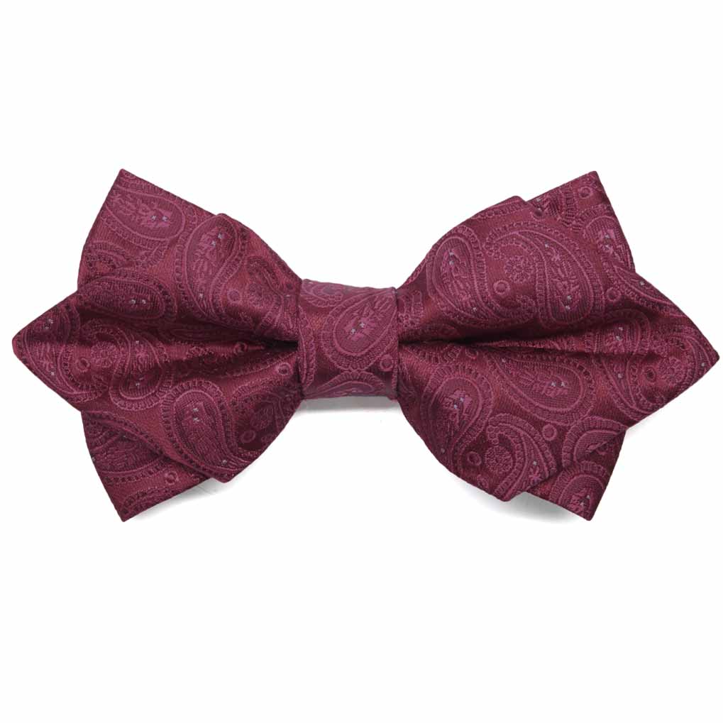 Add a touch of sophistication to your wardrobe with this burgundy paisley diamond tip bow tie. The rich, deep red hue combined with the intricate paisley pattern creates a timeless and elegant look that pairs beautifully with both formal and semi-formal attire. Ideal for weddings, galas, or any special occasion, this bow tie offers a refined pop of color that stands out without being overpowering. Its diamond tip design gives a modern twist to a classic pattern, making it a versatile accessory that can be worn with a variety of suits and dress shirts. Perfect for the gentleman who appreciates classic style with a touch of flair.