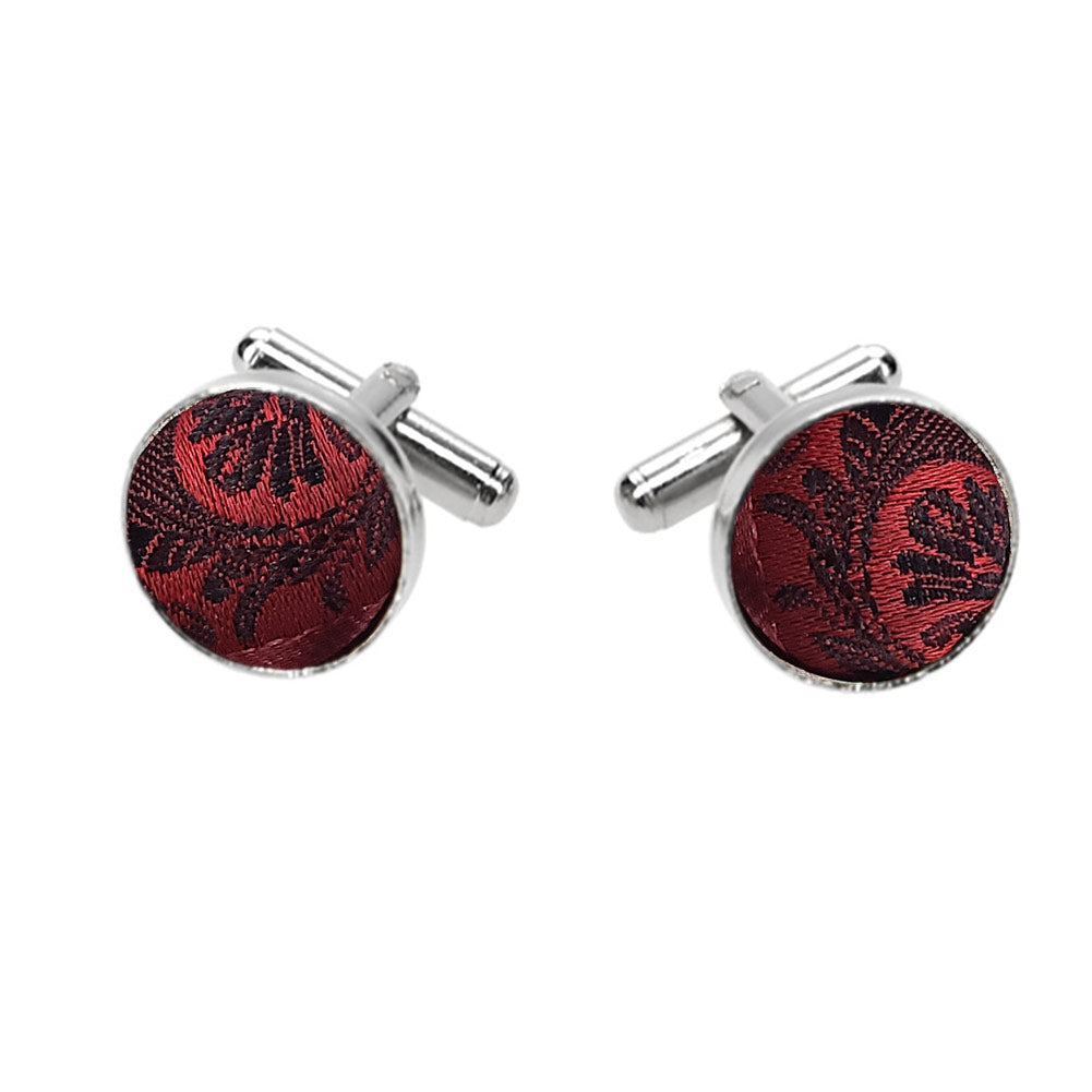 We find these burgundy paisley cufflinks quite elegant. The fabric pattern is accented by a traditional, silver-tone backing. Simple to use and to match to formal attire. Great wedding day accessory for the groom!