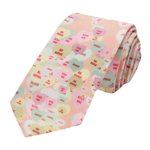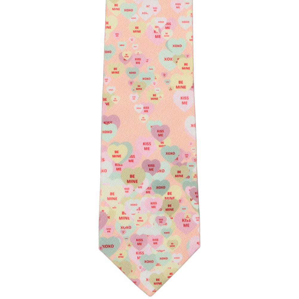 Calorie-free, but still so sweet! This slim and modern necktie is covered in classic candy hearts. The light pastel heart pattern is subtle enough for the office when you wear it with slacks and a button down shirt. Dress it up with a navy blue or black fitted suit for a dinner date. Finish off your look with the matching pocket square (sold separately).
