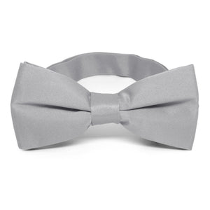 These men's silver bow ties feature a pre-tied bow. The bow tie attaches securely around the neck via an adjustable band collar that expands to fit neck sizes from 12 to 21-inches. The light satin finish isn't too shiny or too matte.