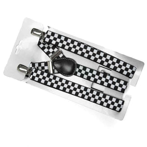 Hey race fans! These fun suspenders feature a black and white checkered design. They're sized for adults with straps that adjust up to 47-inches and hold securely in place with three silver-tone clips. Y-back design with a black crosspatch.
