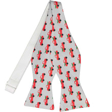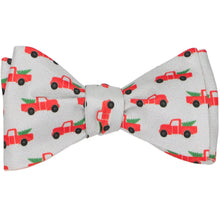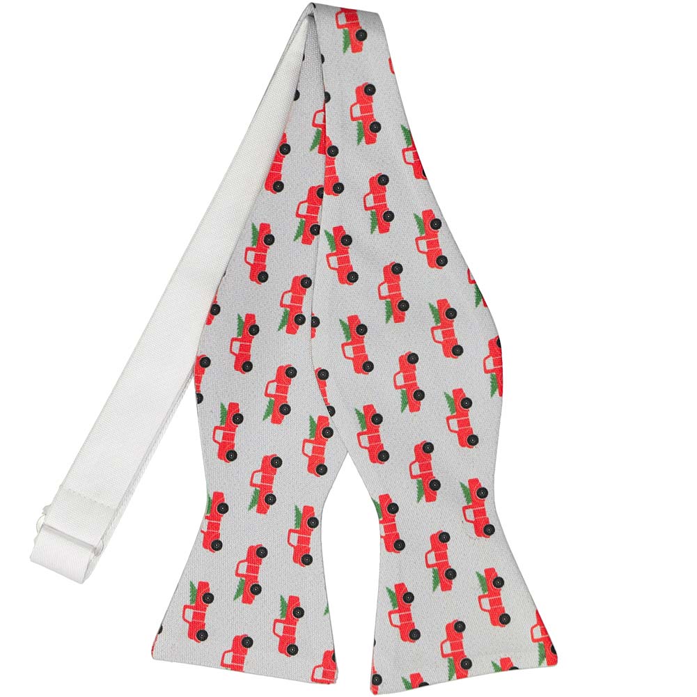 Rev up the Christmas cheer. If you're the DIY kind of guy who likes to chop down your own Christmas tree and tie your own bow tie, do we have the holiday accessory for you! This festive self-tie bow tie features quintessential red pickup trucks hauling evergreens on a neutral gray background. Perfect for adding holiday cheer to your work or formal attire.