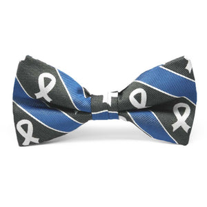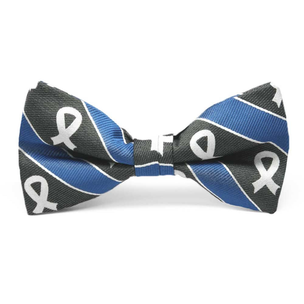 Show your support with this colon cancer awareness cotton/silk bow tie. It features a white ribbon on a black background with blue and white ribbed stripes. The pre-tied band collar is adjustable for neck sizes from 14.5 to 20 inches. Made from a heavyweight, woven blend of cotton and silk. More styles and color combinations available.