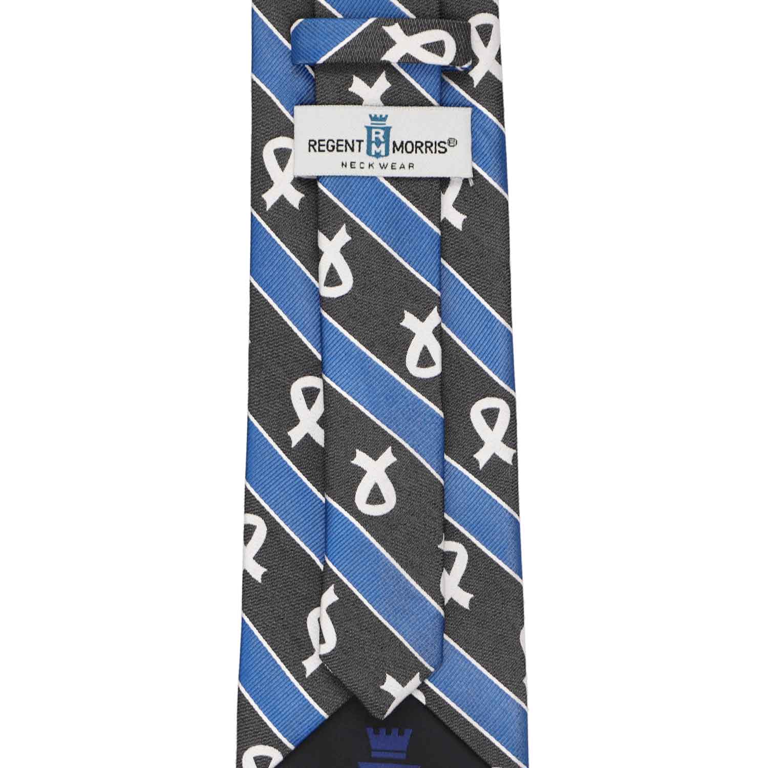 Show your support with this colon cancer awareness cotton/silk necktie. It features a white ribbon on a black background with blue and white ribbed stripes. Made from a heavyweight, woven blend of cotton and silk and cut in a slightly trimmed 3.25-inch width and 57-inch length. More styles available.
