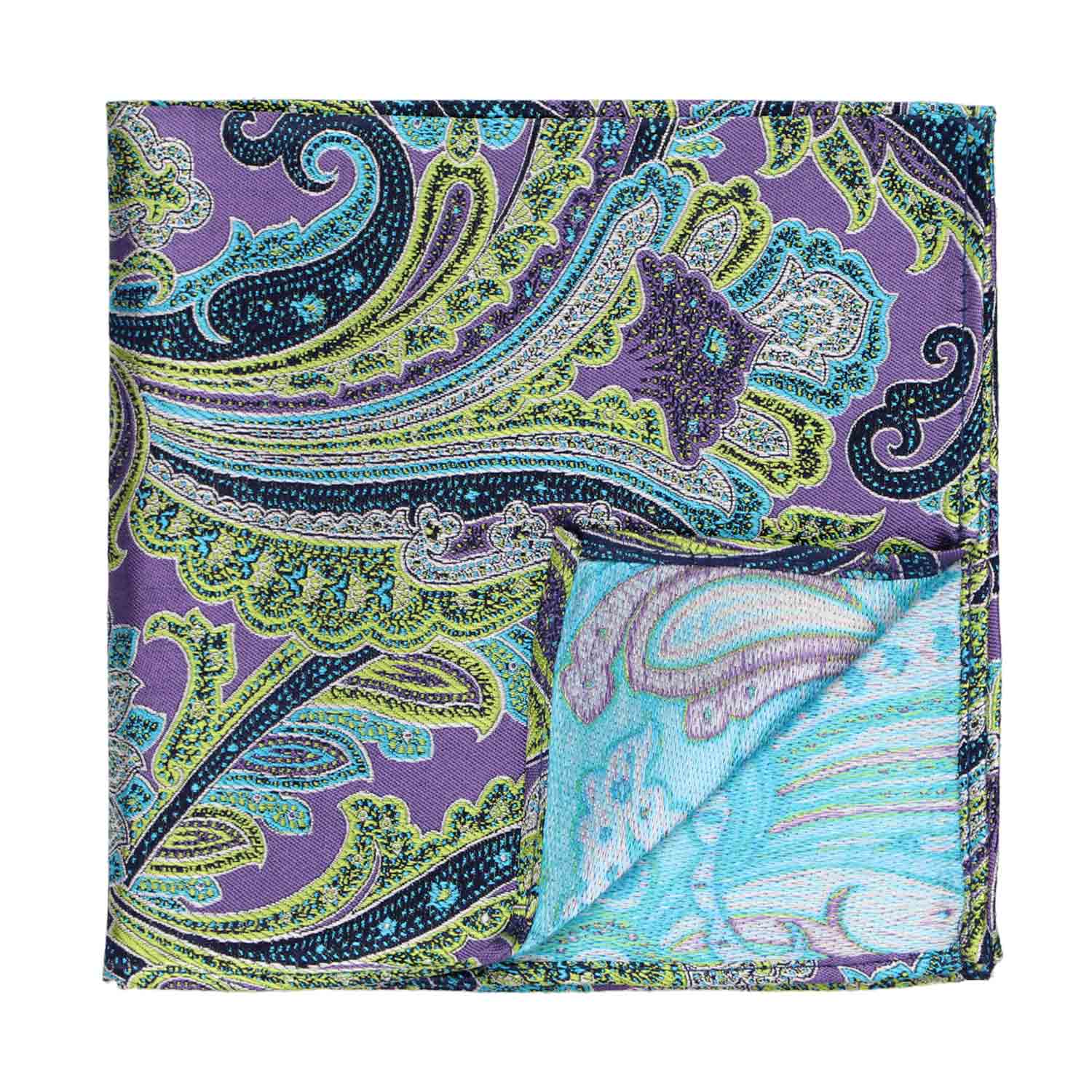 Decadent swirls of purple, turquoise and lime green paisley come together to create an eye-pleasing color palette on this pocket square. Planning a wedding? You and your groomsmen will look dashing and perfectly coordinated with your bridesmaids when you purchase the matching ties (sold separately) in this pattern.