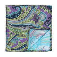 A folded purple blue and green paisley pocket square