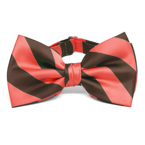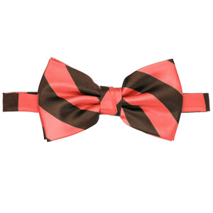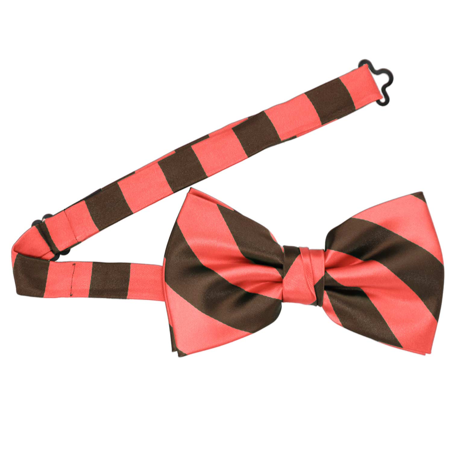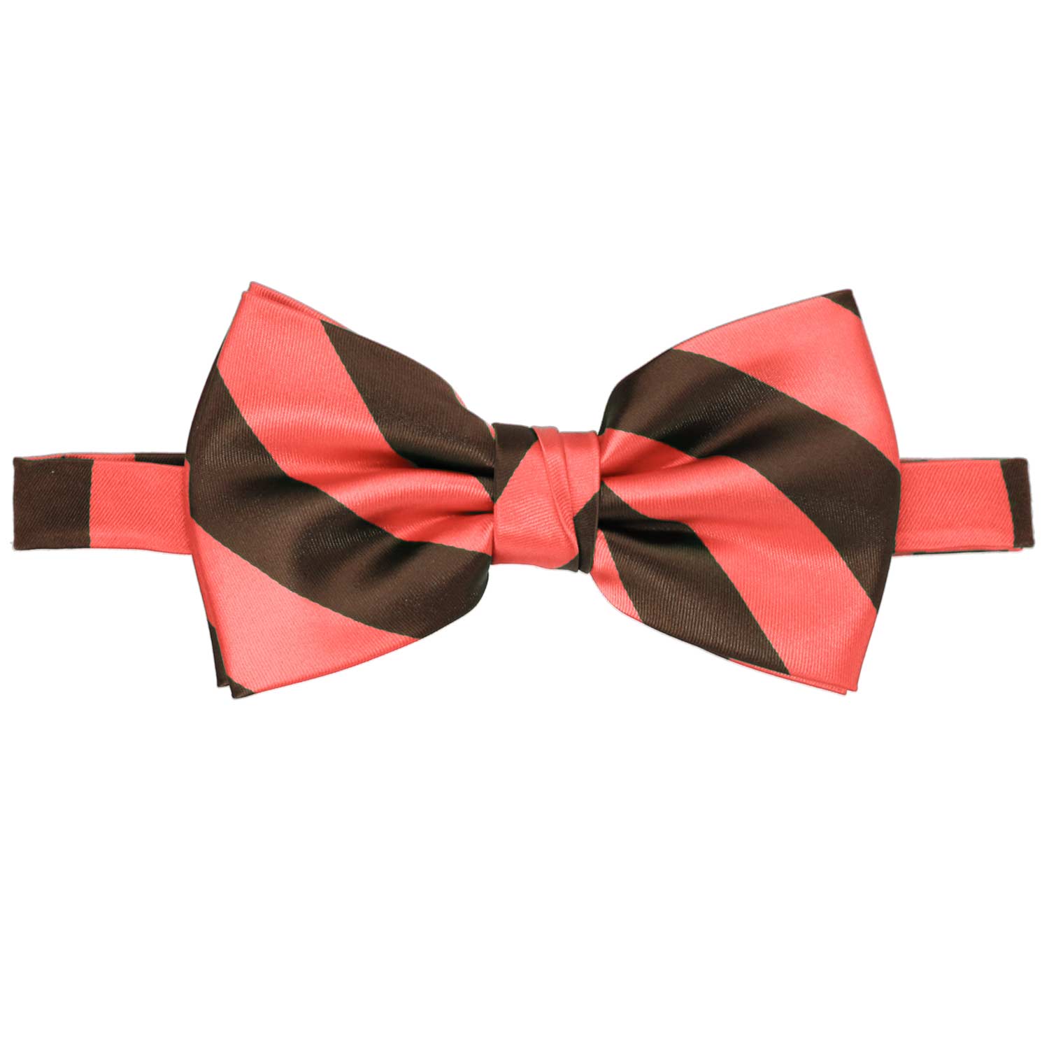 This bright coral and brown striped bow tie features a pre-tied, band collar style that expands to fit neck sizes up to 19-inches. Made from heavyweight woven material with a smooth satin finish. Look for this color combo in a men's necktie and pocket square.