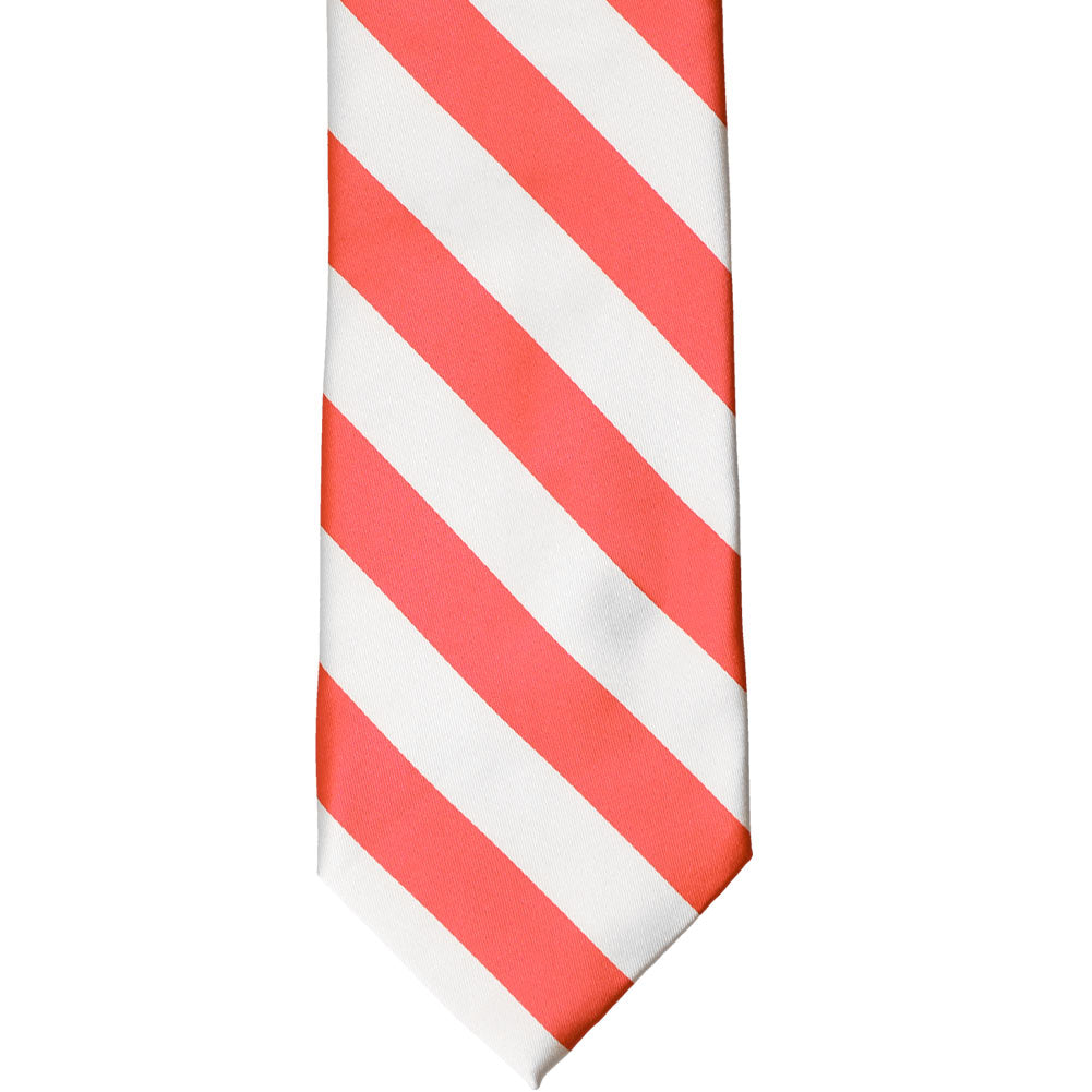 Add this bright coral and white striped tie to your warm weather attire for a bright pop of color. The 0.75-inch stripes keep this tie traditional, while the color combo gives it a vibrant boost. Easily match this tie to your wedding colors and coordinate your groomsmen in matching solid color bright coral ties. This pattern is also available in a self-tie bow tie.