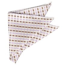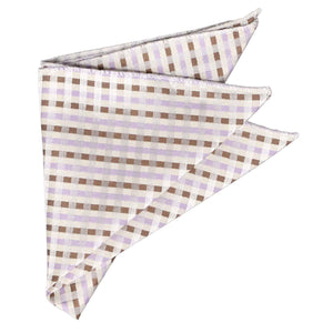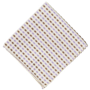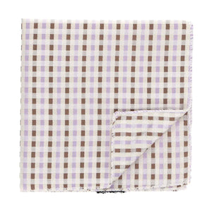 Planning a wedding? This cream and brown gingham pocket square with subtle hints of lavender is the perfect finishing touch for your groomsmen. Whether styled with tan suspenders, a crisp white shirt, and slacks for an outdoor celebration or paired with a navy, tan, or brown suit for an indoor affair, its timeless pattern and soft color palette ensure a polished look. A versatile piece they'll reach for long after the big day!