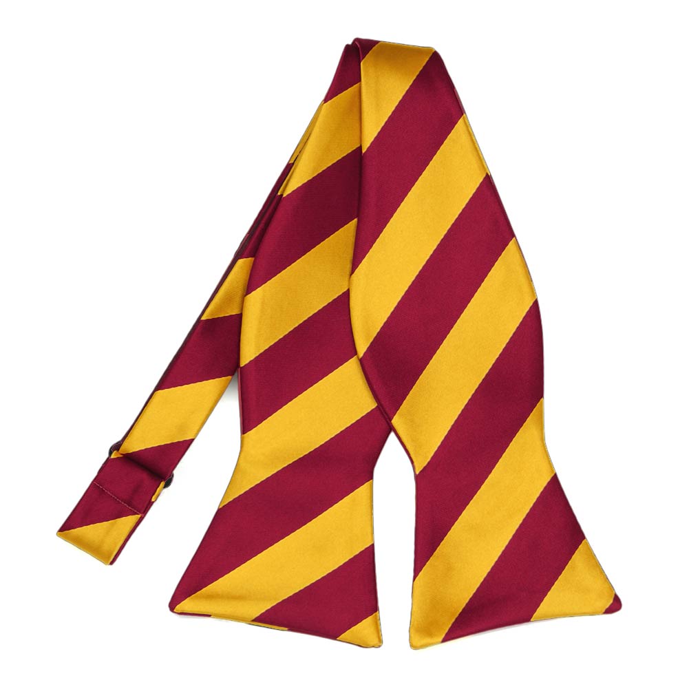 Crimson red and golden yellow striped self-tie bow tie, tied