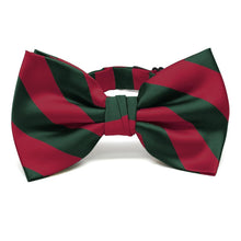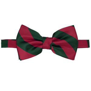 This crimson red and hunter green striped bow tie features a pre-tied, band collar style that expands to fit neck sizes up to 19-inches. Made from all polyester microfiber, it is designed to match our bestselling men's crimson red and hunter green striped tie. Matching pocket squares available for purchase.