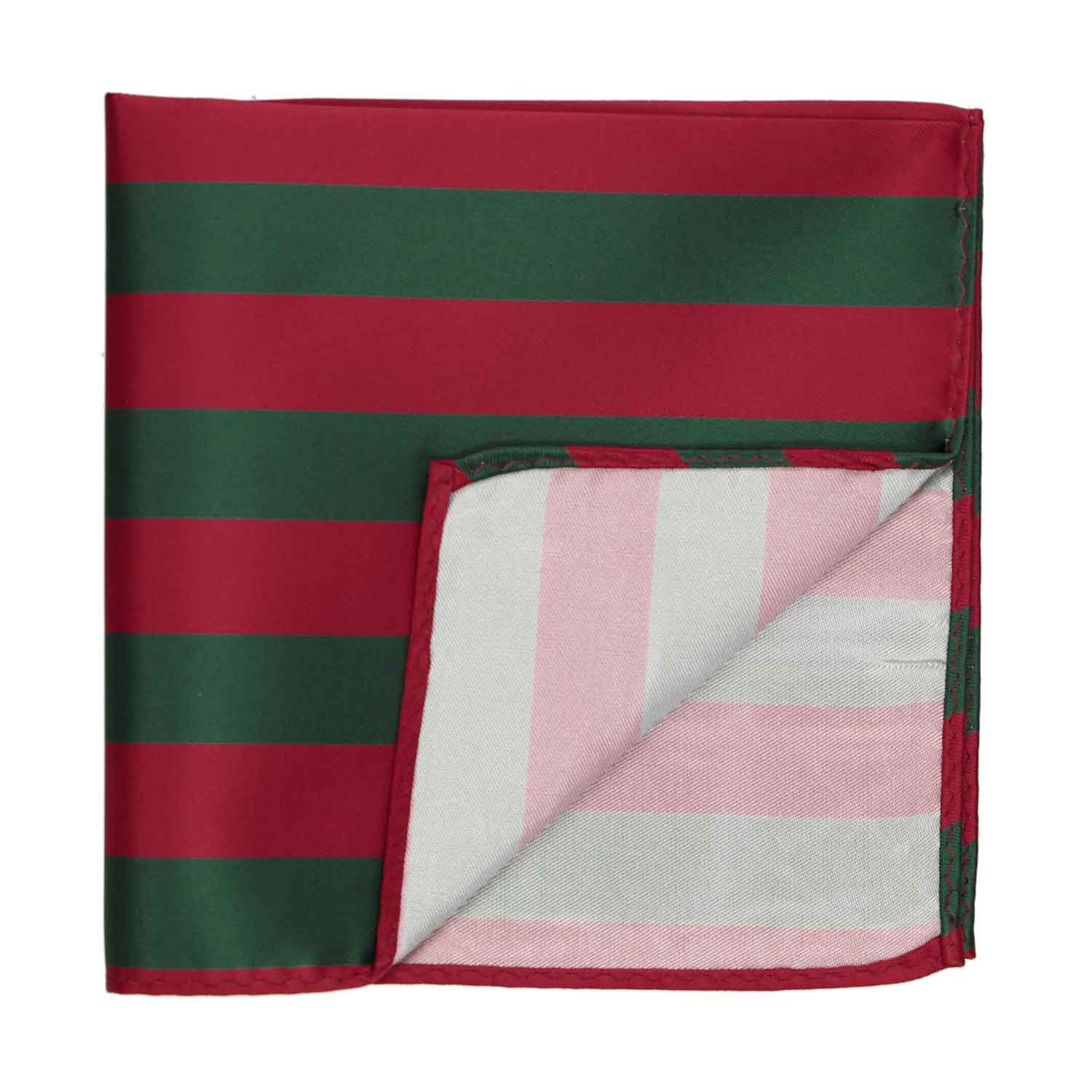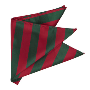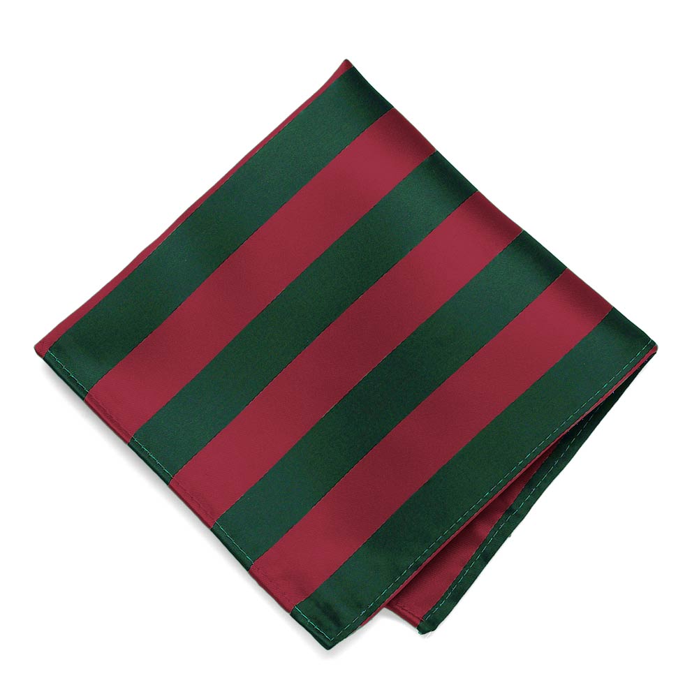 This crimson red and hunter green striped pocket square measures a large, 12-inches by 12-inches to suit a wide variety of folds. The tightly woven material creates a smooth finish for a sharp look. Matches our crimson red and hunter green striped ties and bow ties.