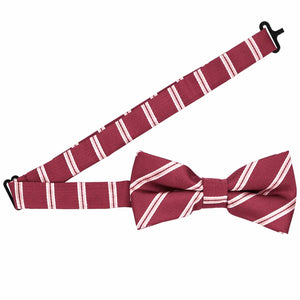 Perfect for everyday style! This burgundy striped bow tie combines classic design with effortless wearability. Featuring light coral, burgundy, and white pencil stripes, it’s a versatile addition to your daily wardrobe. The pre-tied bow and adjustable band collar ensure a comfortable fit for most adult neck sizes.