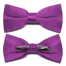 Wear a perfect bow every time with this dark orchid clip-on bow tie. This pre-tied bow tie features a heavyweight clip that discretely attaches to either side of your shirt collar material for a secure fit. One size fits all, regardless of neck size. Has a shiny, satin look. Matching pocket squares available.