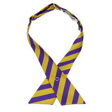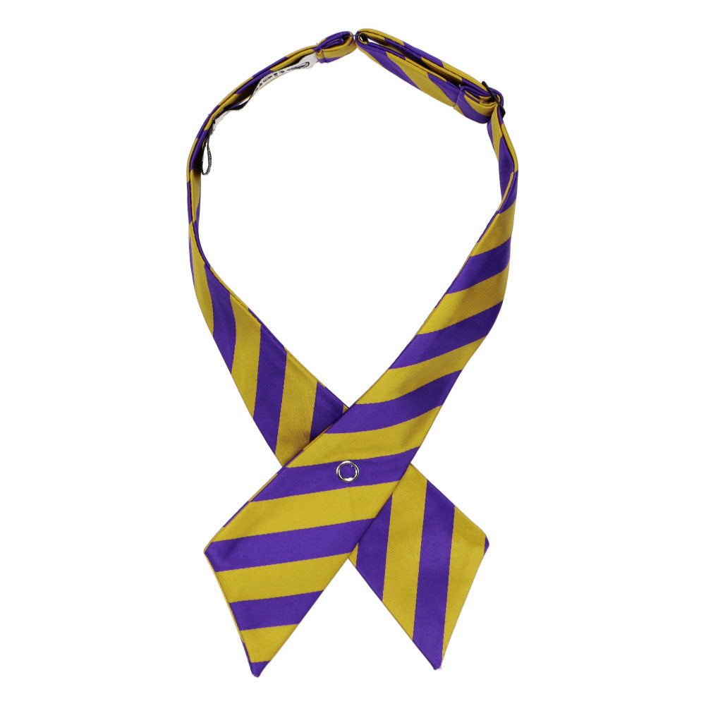 This dark purple and gold striped crossover tie is designed to coordinate with our line of striped ties. At a half-inch wide, the stripes are a slightly narrower width than our men's striped ties. The crossover tie stays securely in place with a silver open ring snap and adjusts to fit neck sizes up to about 17-inches.