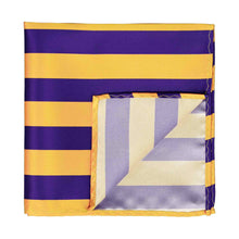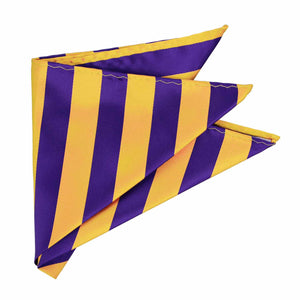 This dark purple and golden yellow striped pocket square measures a large, 12-inches by 12-inches to suit a wide variety of folds. The tightly woven material creates a smooth finish for a sharp look. Matching ties, bow ties and more available for purchase.