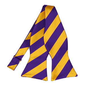 This classic dark purple and golden yellow striped self-tie bow tie measures approximately 4-inches across by 2.5-inches high when tied. The adjustable neck fits sizes from 13.75 to 20-inches. Made from all polyester microfiber.