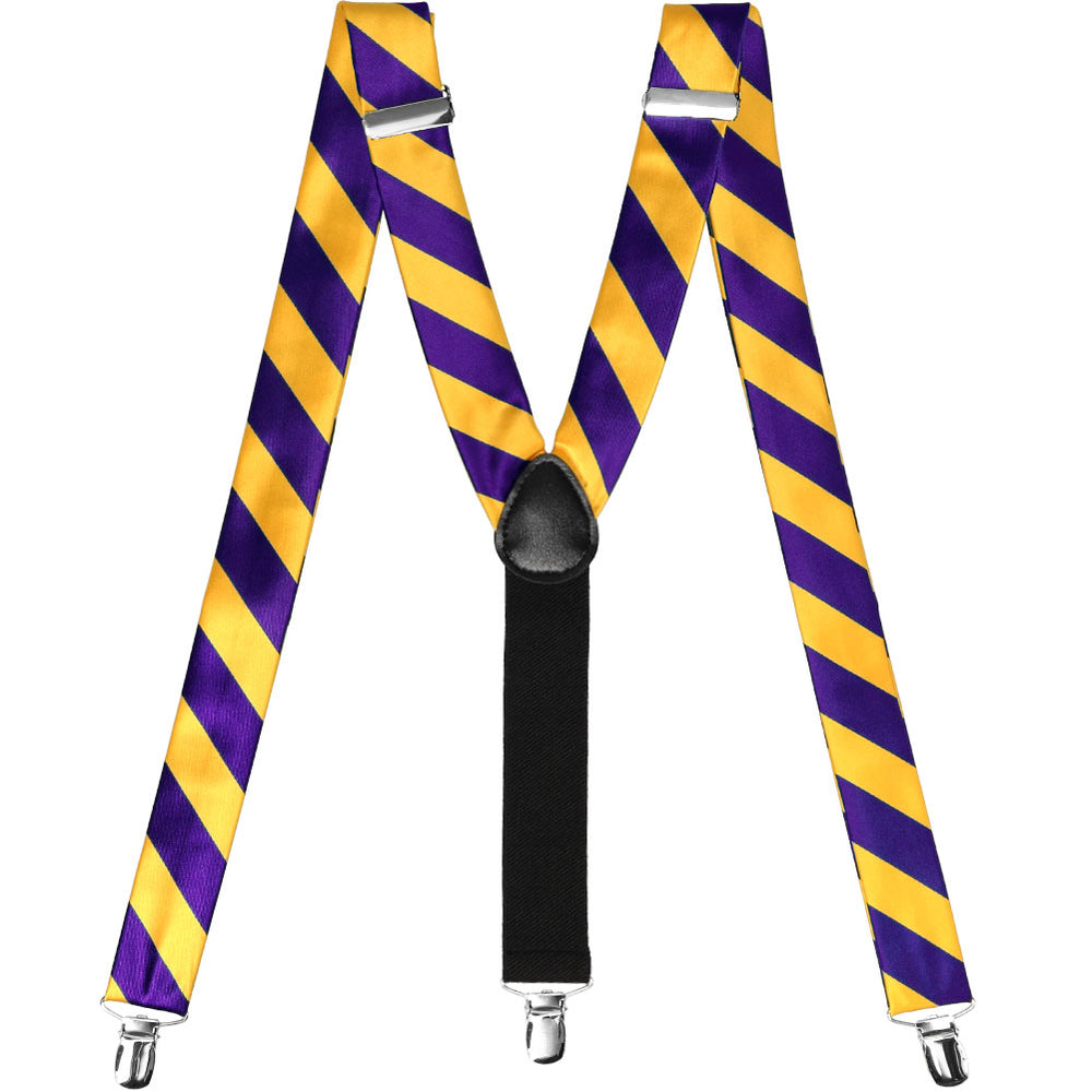 Whether you're showing your school spirit or rooting for your favorite team (in style), these dark purple and golden yellow striped suspenders are a must. Made from the same material as our ties, the suspenders feature 1.25-inch wide straps with 0.75-inch wide stripes. They adjust from approximately 30.5 to 49-inches to fit most men, women and teens and hold securely in place with three silver-tone clips. Y-back design with a black crosspatch. Looks great with the matching bow tie and pocket square!