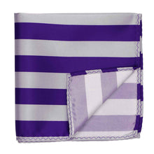 This dark purple and silver striped pocket square measures a large, 12-inches by 12-inches to suit a wide variety of folds. The tightly woven material creates a smooth finish for a sharp look. Matching ties and bow ties available.