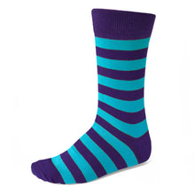 Pair of men's dark purple and turquoise striped socks, horizontal stripes