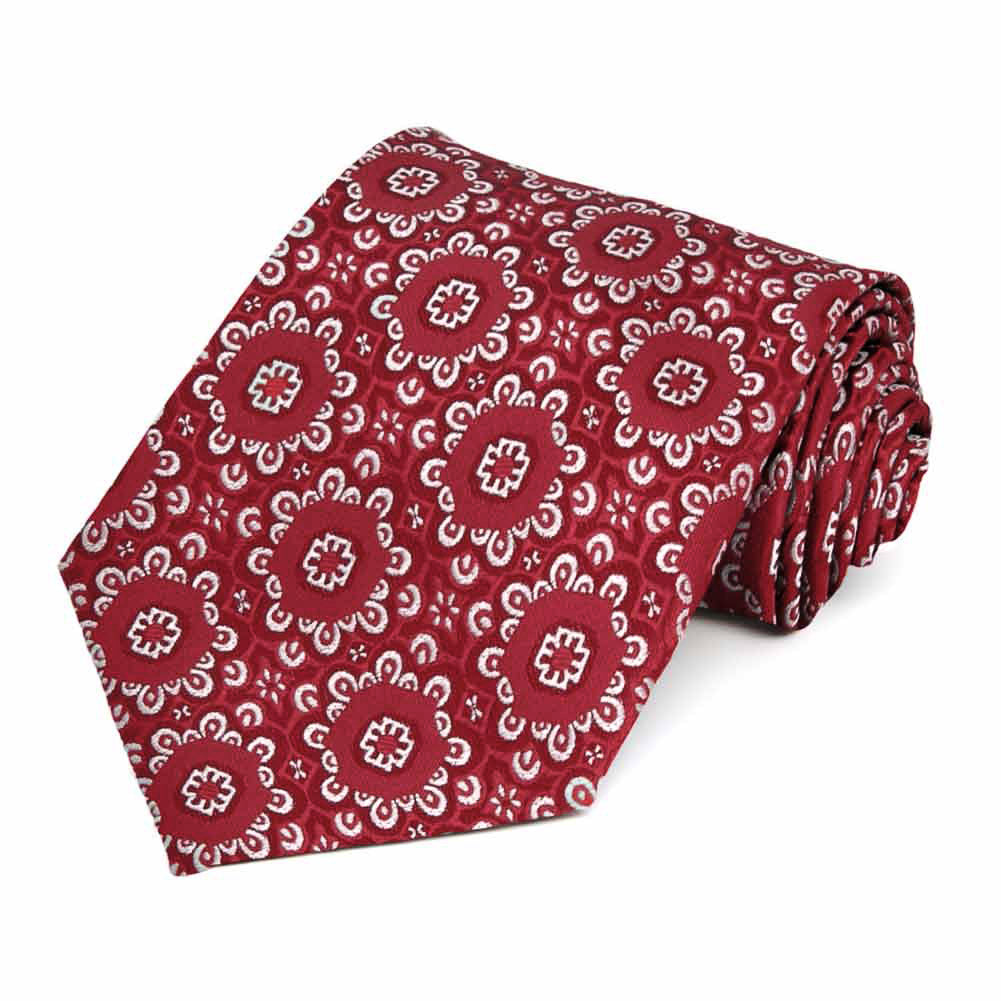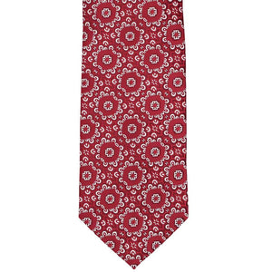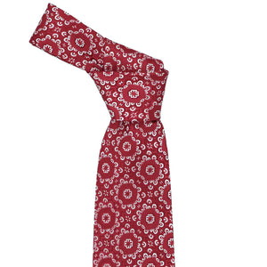 Here's a uniquely patterned men's tie to add to your collection. It features an attractive, abstract floral design in deep red. The pattern is large, yet subtle. If you're wearing a suit, try it with navy blue or gray and a crisp white shirt.
