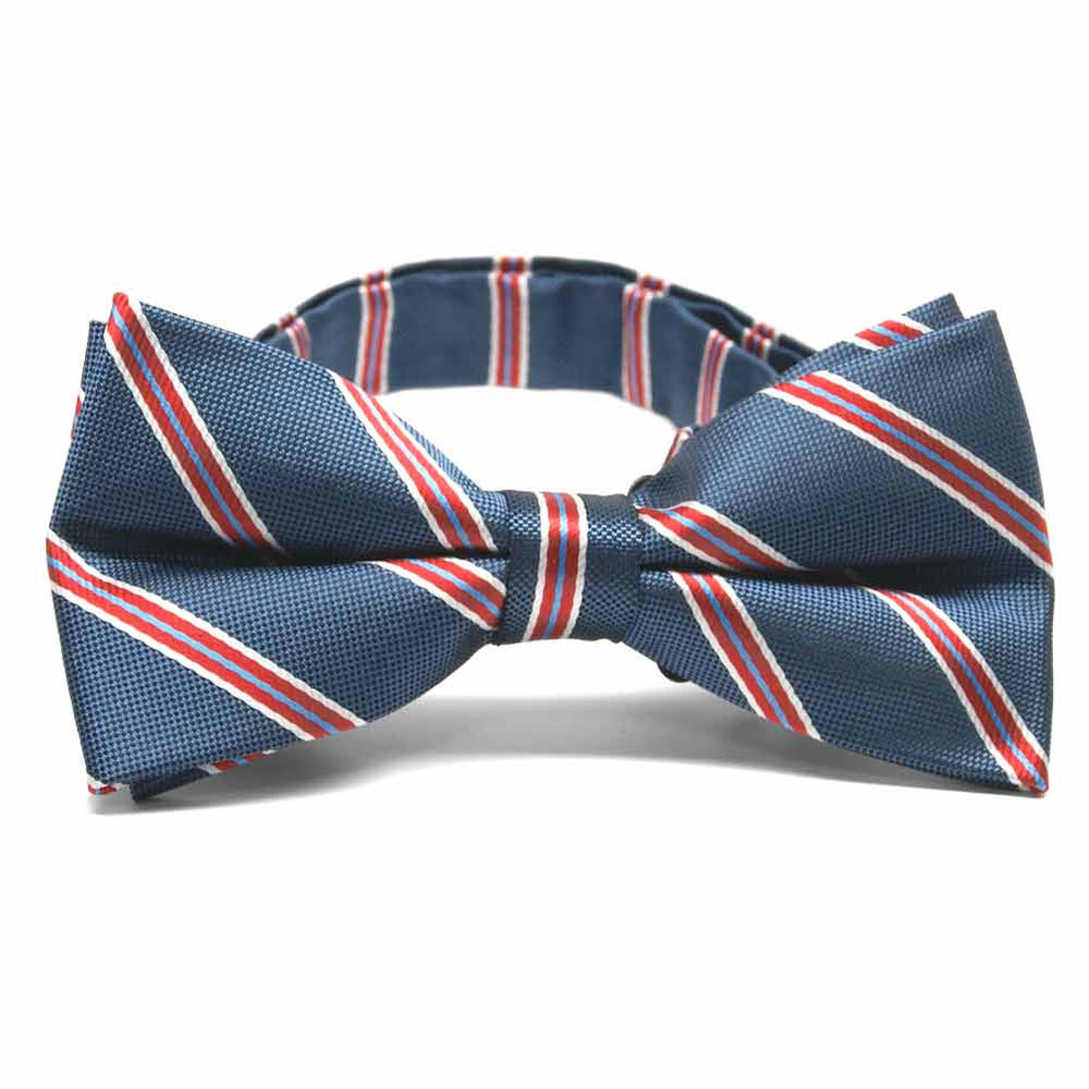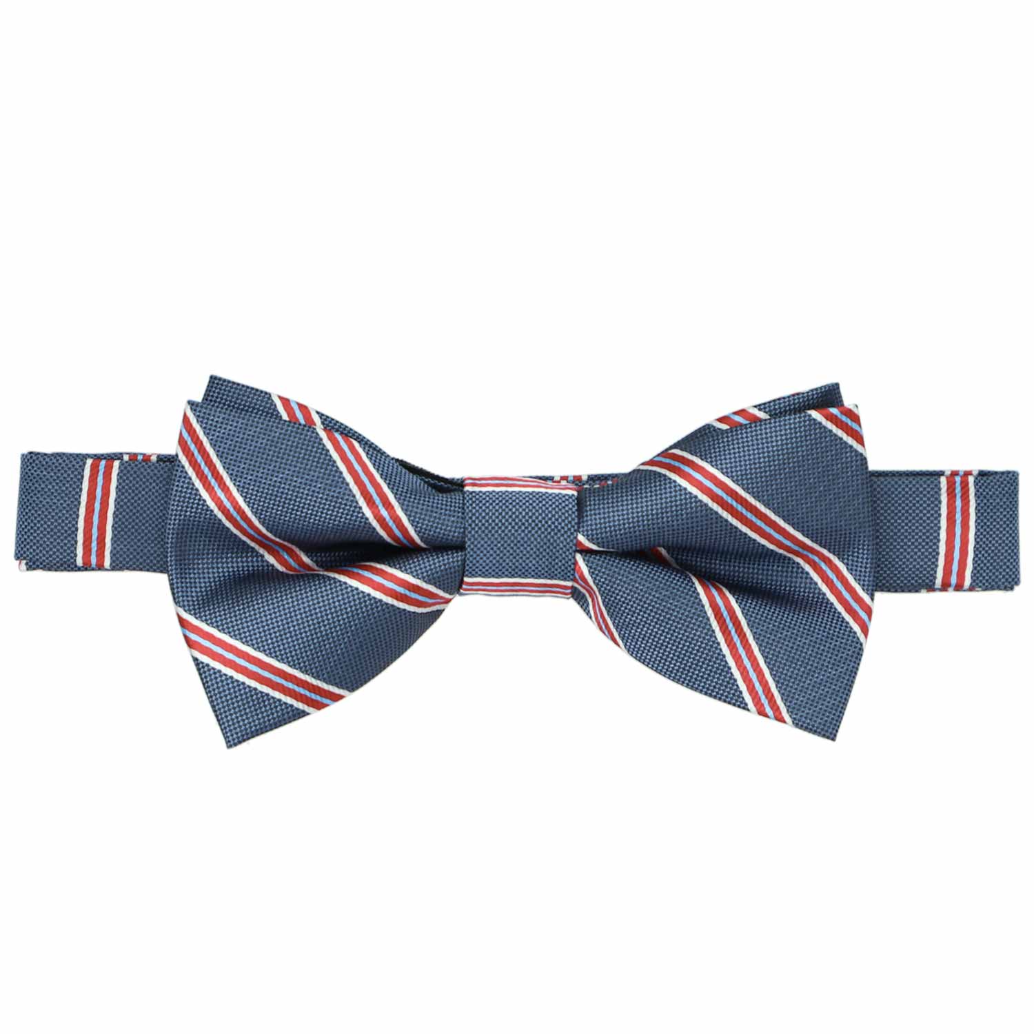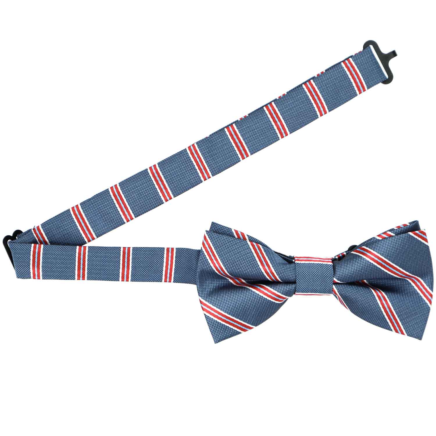 Keep it casual and laid-back with this denim blue striped bow tie. Featuring a relaxed design with red, light blue, and white pencil stripes, it’s perfect for easygoing style. The pre-tied bow and adjustable band collar make it simple and comfortable to wear.