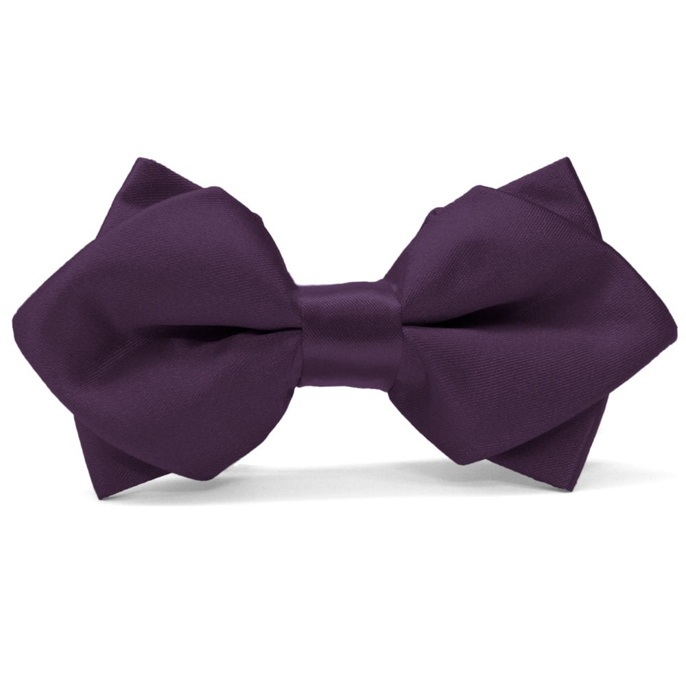 This eggplant purple pre-tied diamond tip bow tie is stylish and classy. It features diamond tips in the front and traditional bow tips in the back. The bow tie attaches securely around the neck via an adjustable band that expands to fit neck sizes from 12 to 21-inches. Shiny, satin look. See related products for matching items.