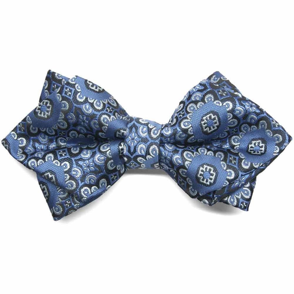 Different than a traditional bow tie, this diamond-tip bow tie features elegant diamond-shaped tips in the front and regular bow tips in the back. It's pre-tied and features an adjustable band collar that fits adults and teens with neck sizes from 12 to 21 inches. Made from durable polyester with a textured finish. The bow itself is an average size when worn.