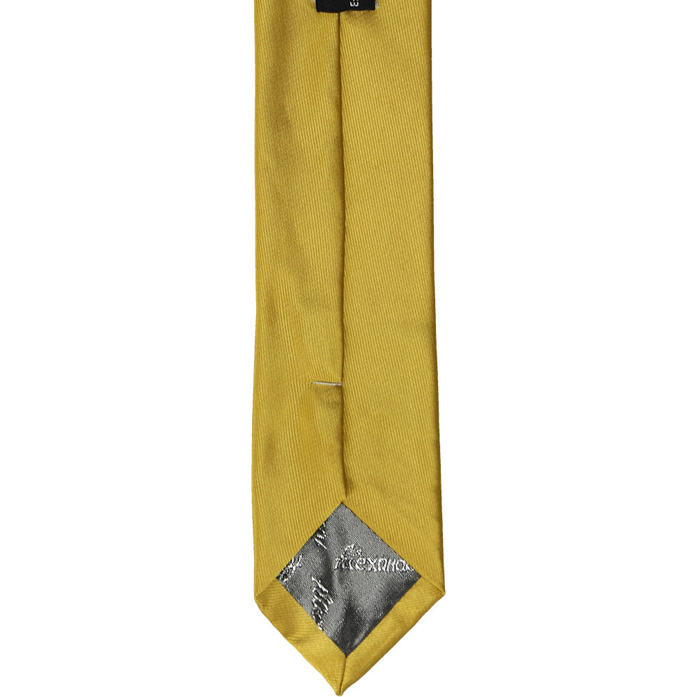 This gold skinny tie is made from a heavyweight woven material with slight ribbing. The finish is between shiny and matte, which we think you'll like. There are matching pocket squares available for purchase.