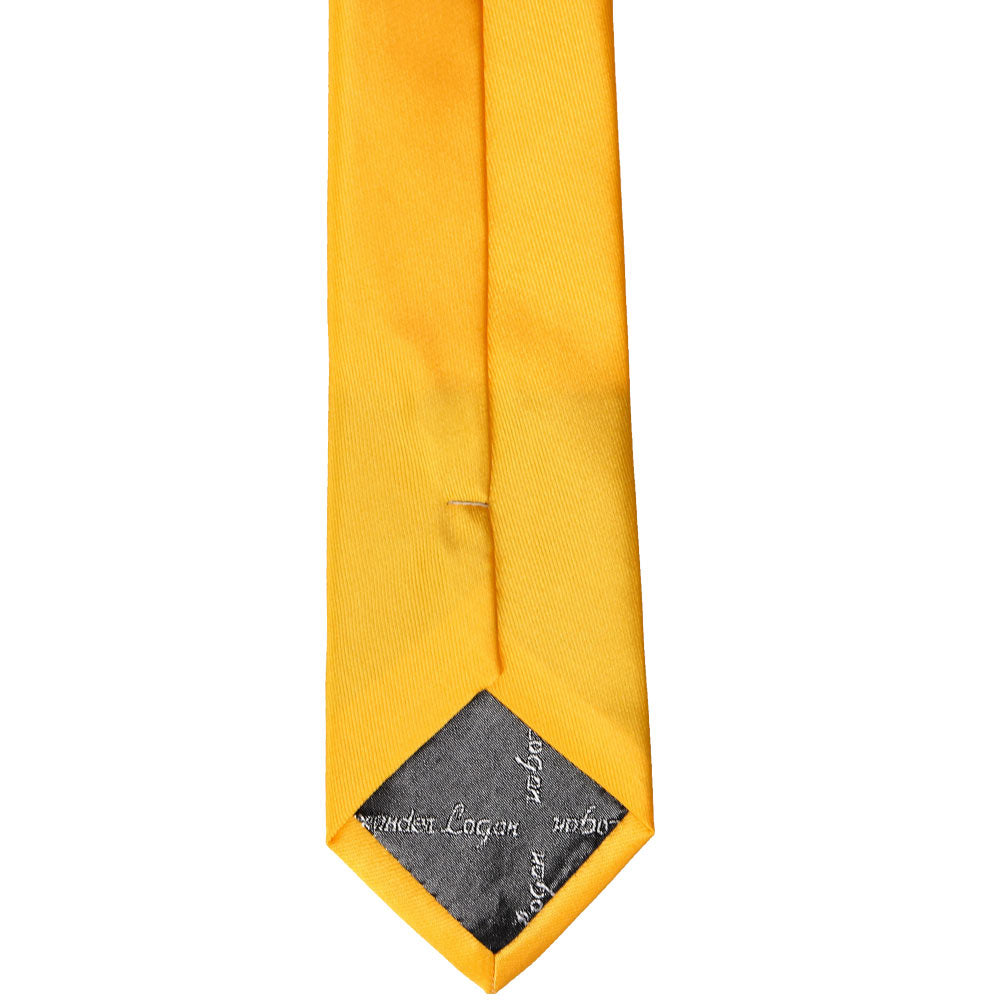 This golden yellow slim necktie provides a subtly trendy look without going too skinny. The 2.5-inch width measures 0.5-inches wider than today's ultra-trendy skinny ties, but about 1-inch skinnier than a traditional men's tie. The in-between width makes it a popular choice for fashionably outfitting a large group of different-sized men or teens. Made from heavyweight woven material with slight ribbing.