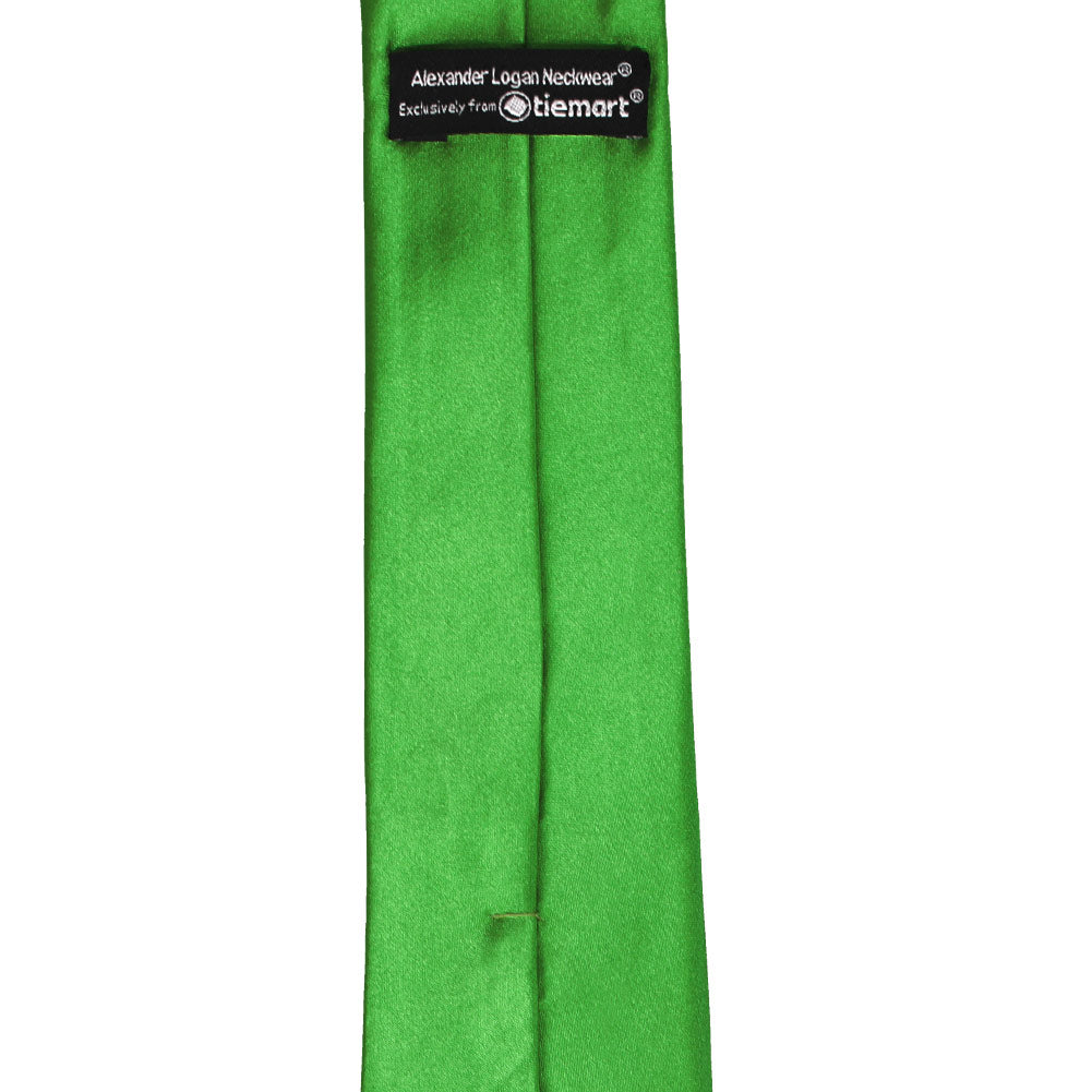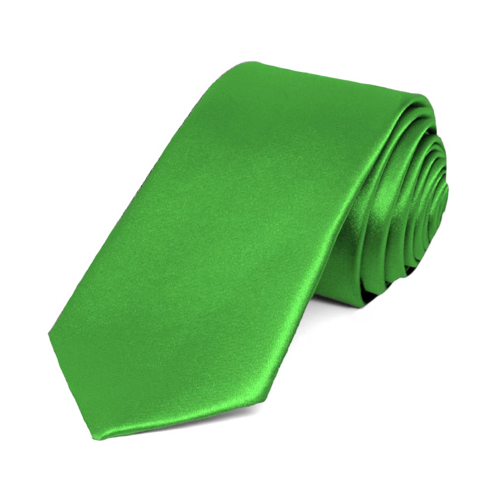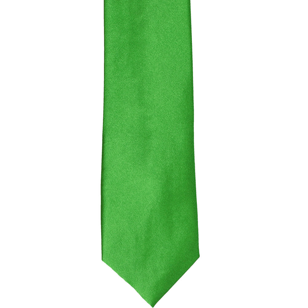 This grass green slim necktie provides a subtly trendy look without going too skinny. The approximate 2.5-inch width measures 0.5-inches wider than today's ultra-trendy skinny ties, but about 1-inch skinnier than a traditional men's tie. The in-between width makes it a popular necktie for fashionably outfitting a large group of different-sized men or teens.