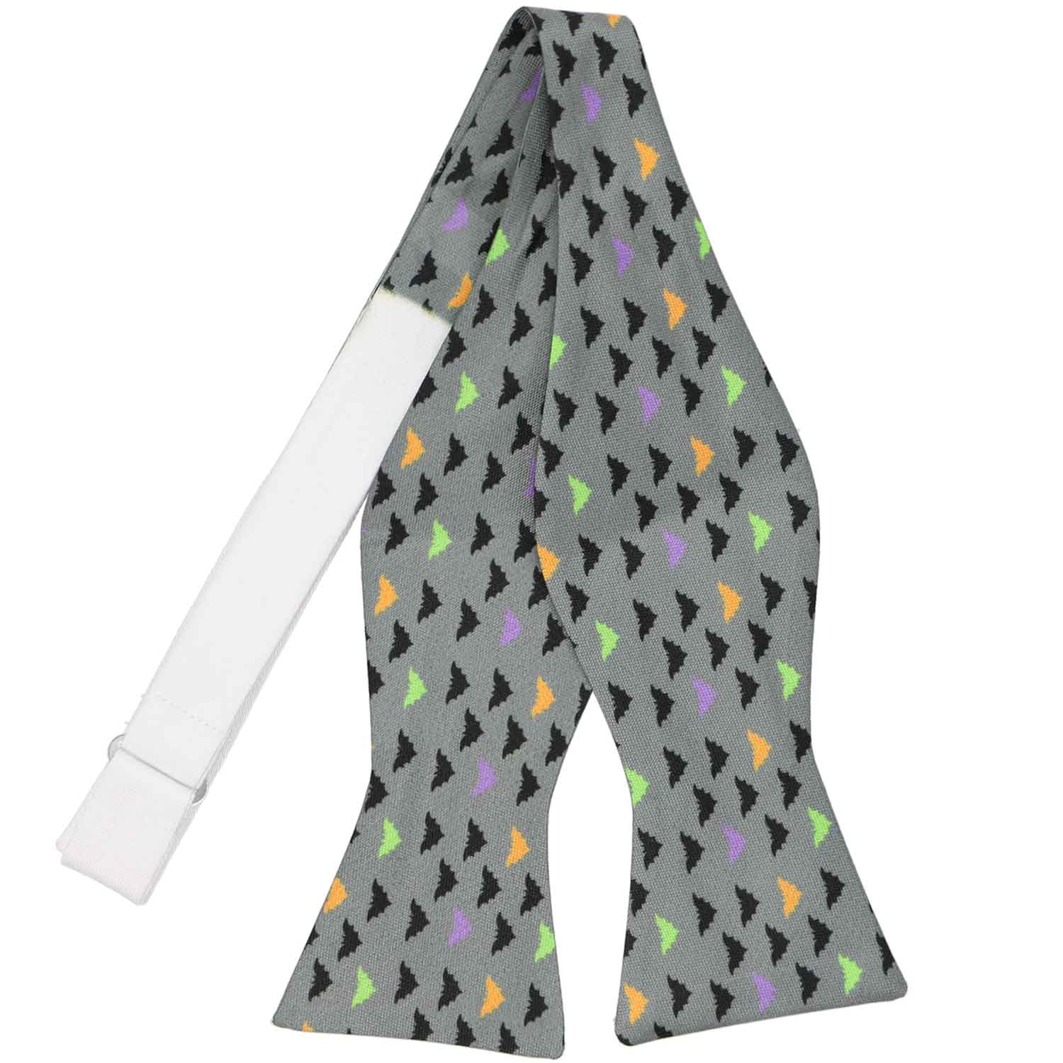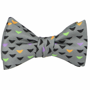 Take flight this Halloween with this spook-tacular bat-themed self-tie bow tie. The eerie design features little bats soaring across a gray background, with a fang-tastic twist—some of them sport Halloween colors to keep your look frightfully fun! Wearing a suit? There are matching pocket squares available for purchase.