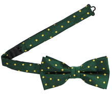 What a fun way to show off your team spirit! This hunter green and gold polka dot bow tie showcases one of our most popular color combinations handsomely. You'll look stylish for a sports banquet, graduation or just another day at the office. (The perfectly sized polka dots mean you can wear this pattern anywhere.) Easy to match to suits and casual wear, alike. Purchase the matching pocket square for those dressier occasions.