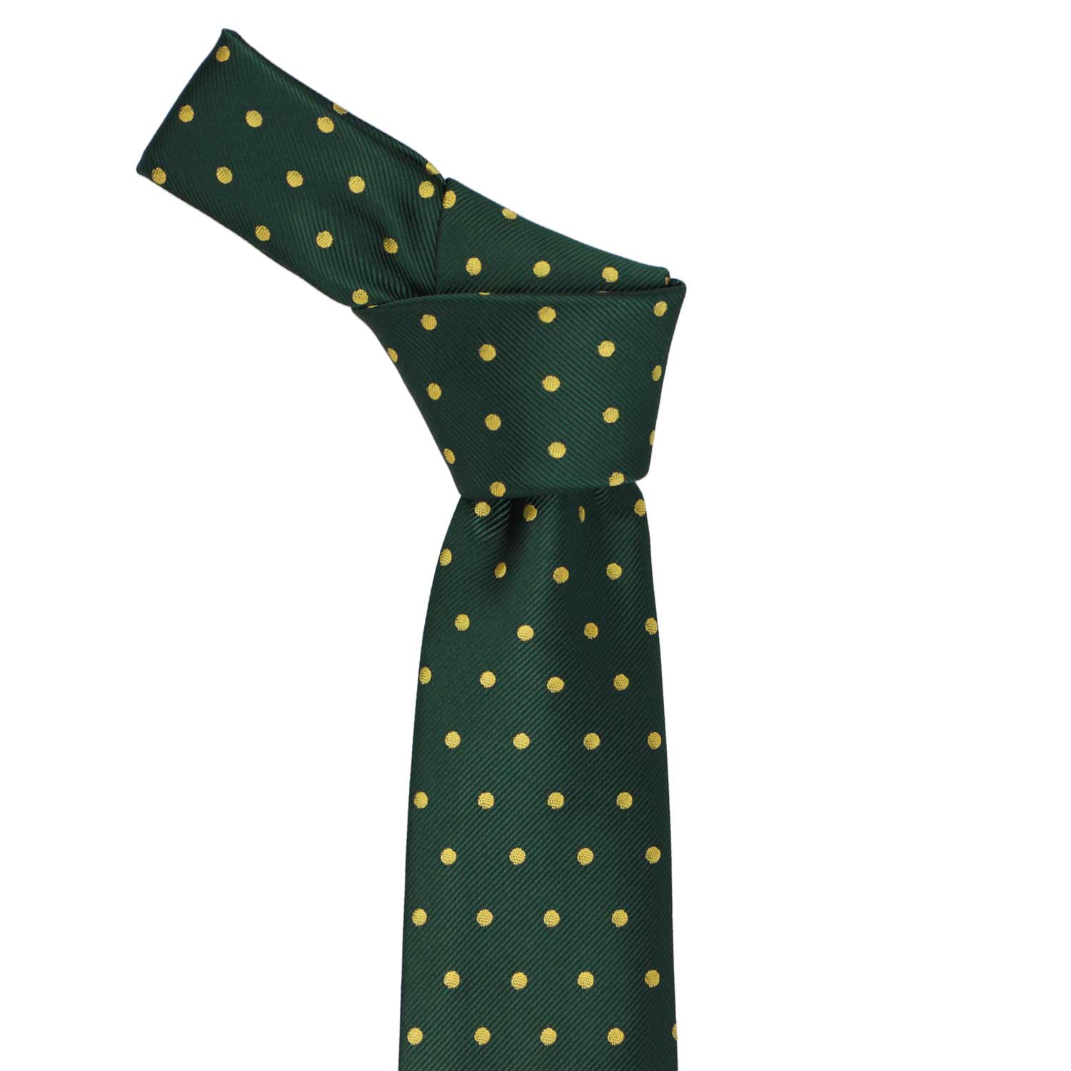 Stylishly support your team or school with this fun hunter green and gold dotted tie. It's a tried and true color combination that will never go out of style, with just the right-sized polka dots to catch the eye without being too flashy. The best part? It goes with virtually everything, from your favorite denim to any color of suit. For those formal occasions, don't forget to purchase the matching pocket square. If you're thinking of getting these for a group, this pattern also comes in a bow tie so you can mix and match styles among personalities.