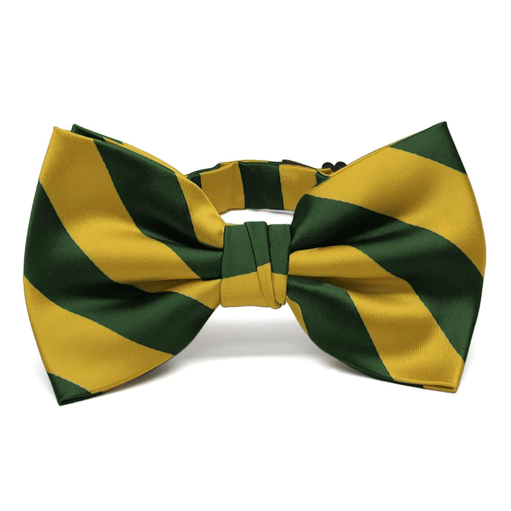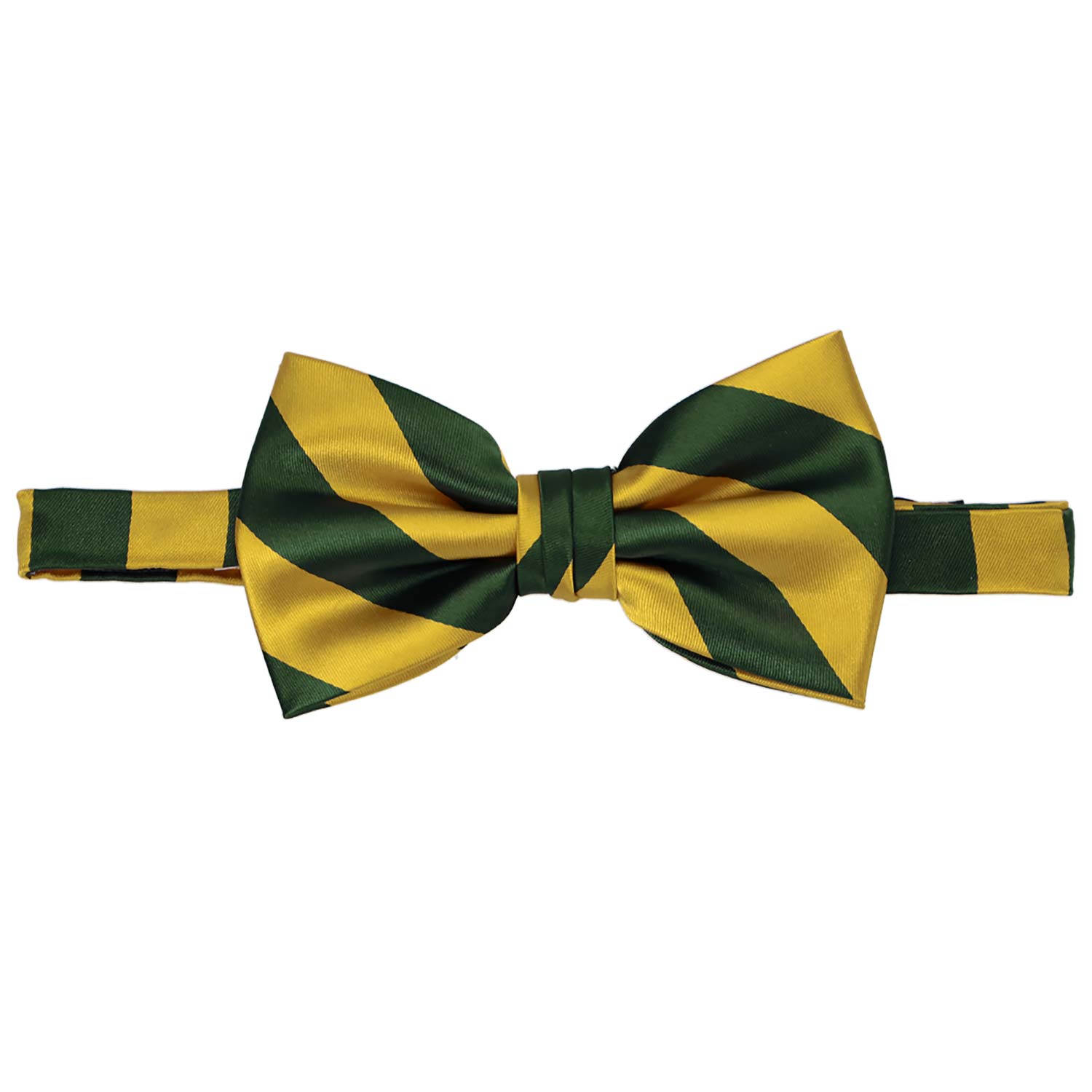 Rock your school or sports team pride with this eye-catching hunter green and gold striped bow tie. This is a great choice for a school uniform. Let the students choose their style because matching neckties are available, too. For an extra boost of spirit, complete the look with our matching pocket square and socks (they're sold separately, but oh-so worth it!).