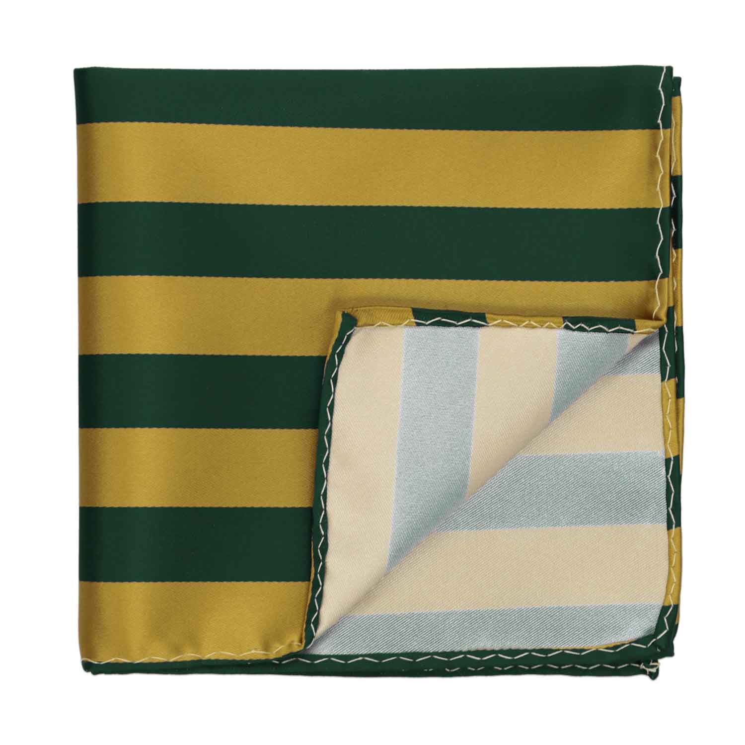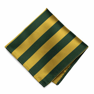 Transform your outfit with one last step: A hunter green and gold striped pocket square folded into your pocket. The two-color stripes are classic, whether you're headed to a school function or giving your sports team a boost. Matching neckties and bow ties are available for a complete hunter green and gold look, but it's certainly easy to pair this pocket square with a solid tie.