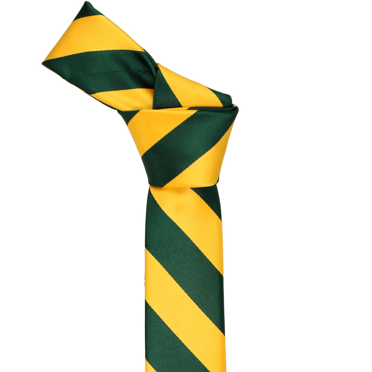 Our most popular striped ties are now available in a trendy, 2-inch width. This skinny hunter green and golden yellow striped tie is made from heavyweight woven material with a smooth, satin finish. Look for this popular color combo in a men's traditional-width necktie, bow tie, pocket square and boys' tie.