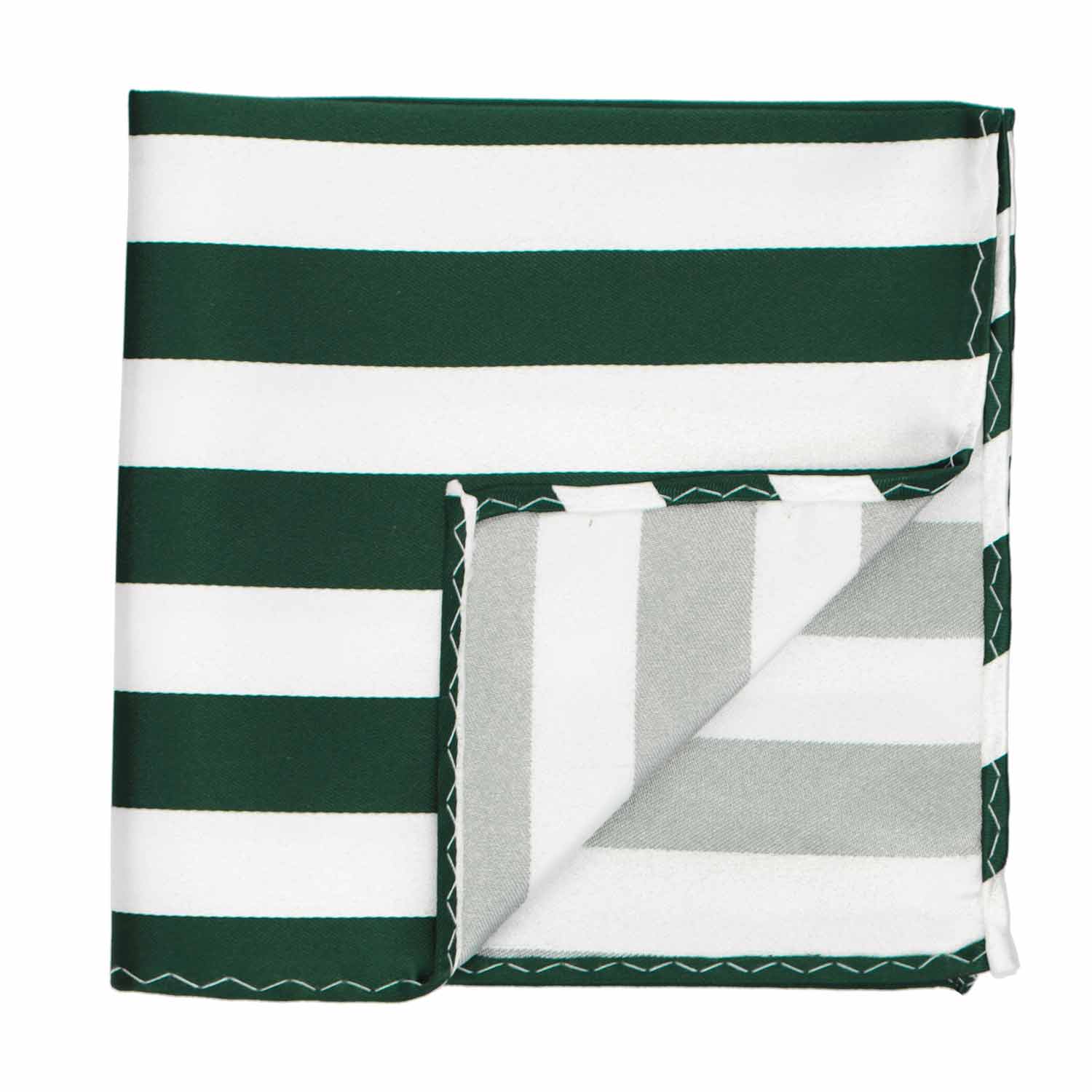 This hunter green and white striped pocket square measures a large, 12-inches by 12-inches to suit a wide variety of folds. The tightly woven material creates a smooth finish for a sharp look. Matches our hunter green and white striped bow ties.