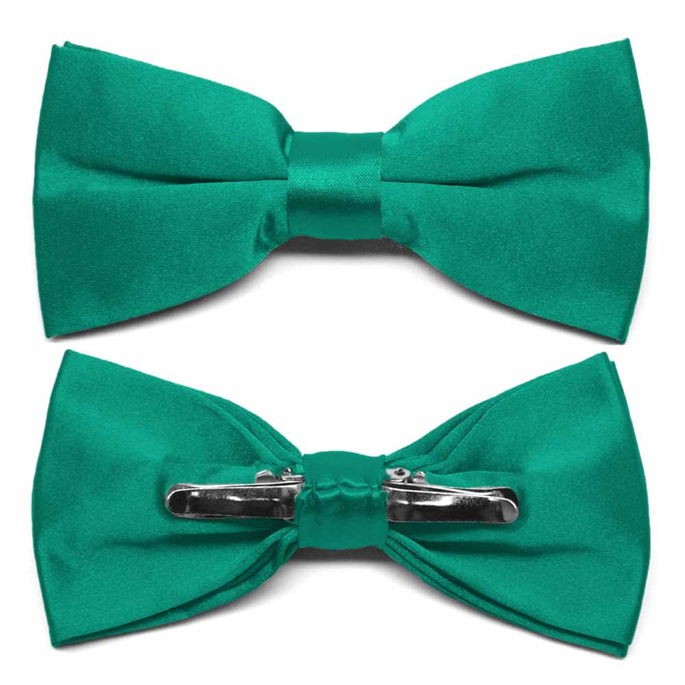 Whether it's a busy workday or something more glamorous, you'll be making a statement in this jade clip-on bow tie. The jewel tone is radiant and easy to coordinate. It compliments navy blue, black and gray suits. Designed for convenience, this pre-tied bow tie is ideal for quick costume changes, perhaps at a dance competition. Now you can take your look a step further with our matching pocket squares and cummerbunds, both sold separately.
