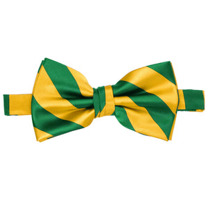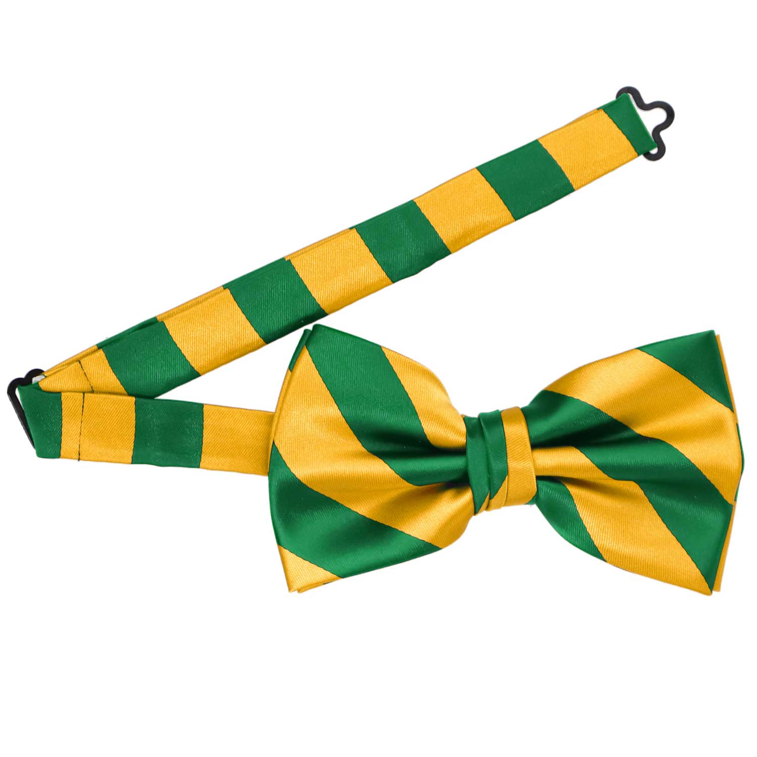 This kelly green and golden yellow striped bow tie features a pre-tied, band collar style that expands to fit neck sizes up to 19-inches. Made from polyester microfiber, it is designed to match our bestselling men's kelly green and golden yellow striped tie.