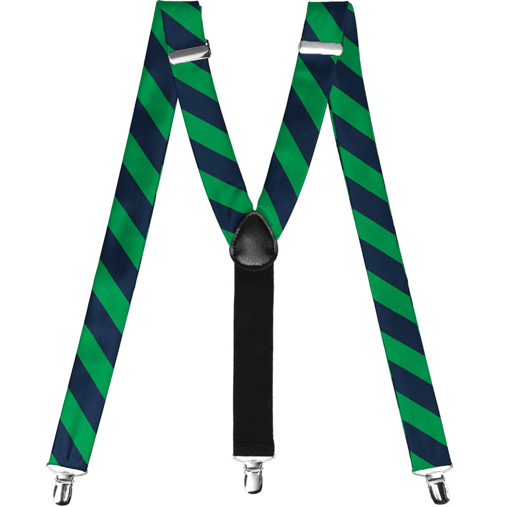 Whether you're showing your school spirit or rooting for your favorite team (in style), these kelly green and navy blue striped suspenders are a must. Made from the same material as our ties, these suspenders feature 1.25-inch wide straps with 1-inch wide stripes. They adjust from approximately 30.5 to 49-inches to fit most men, women and teens and hold securely in place with three silver-tone clips. Y-back design with a black crosspatch. Looks great with the matching bow tie and socks!