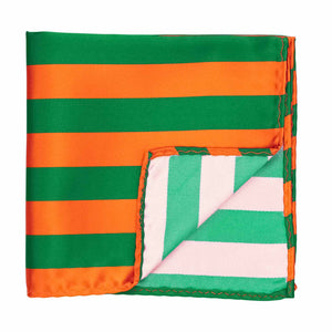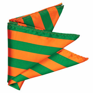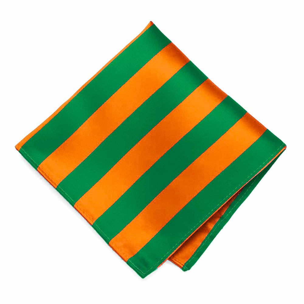 Get ready to represent your favorite team in style with this kelly green and orange striped pocket square! Whether you're gearing up for game day or just want to show your team spirit, this accessory has got you covered. For those formal occasions like awards banquets or graduation, pair it with the matching necktie to complete your look. It looks just as sharp worn on its own for a casual, yet spirited vibe.