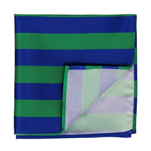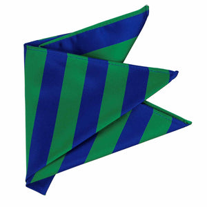 This kelly green and royal blue striped pocket square measures a large, 12-inches by 12-inches to suit a wide variety of folds. The tightly woven material creates a smooth finish for a sharp look. Matches our kelly green and royal blue striped ties and bow ties.